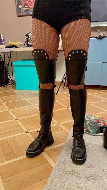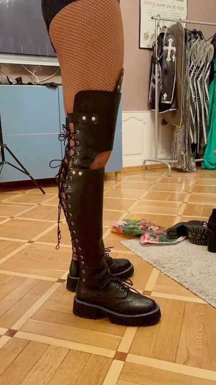Особенности: оригинальный дизайн, съемный верх-трансформер (сапоги-ботфорты), удобные крепежи и эластичные держатели верха (сапоги не сползают и не открываются при резких движениях танцевальных "pas"). В этой версии гамашей использована особенная шнуровка, не стесняющая движений танцоров.