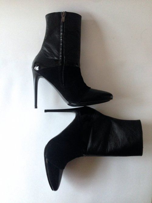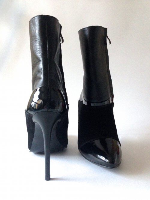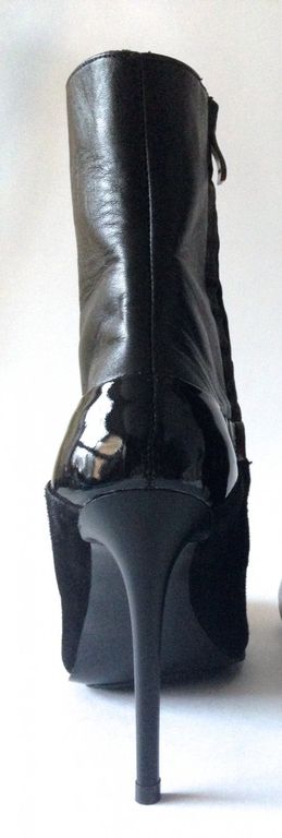 Особенности: стильное сочетание разных фактур (гладка кожа, кожаные велюр и лак), актуальная форма каблука, удобная высококаблучная колодка, "хищная" форма носочной части смотрится женственно и изящно