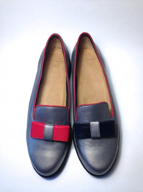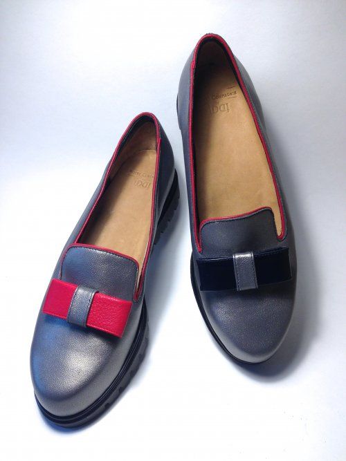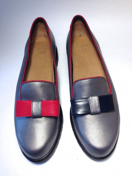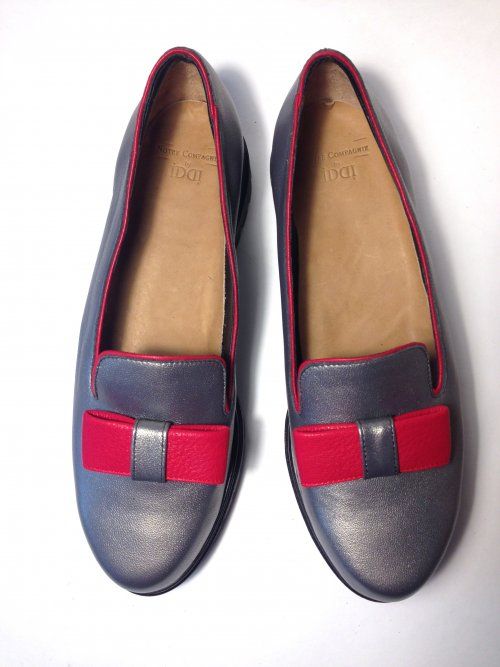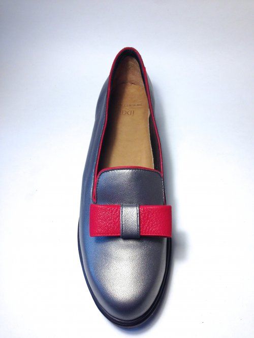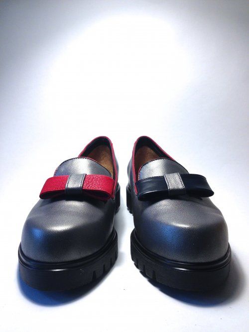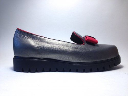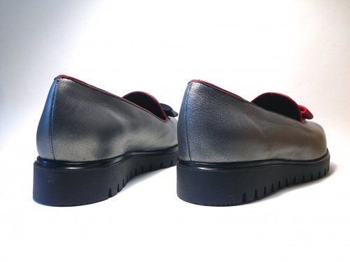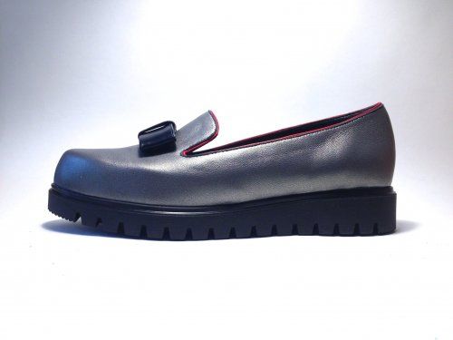Материалы верха: натуральная кожа серебряного цвета, отделка и декор - красный кожаный велюр, черная глянцевая кожа