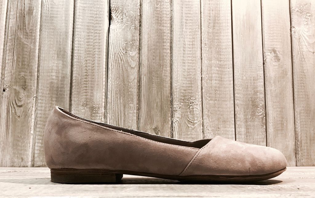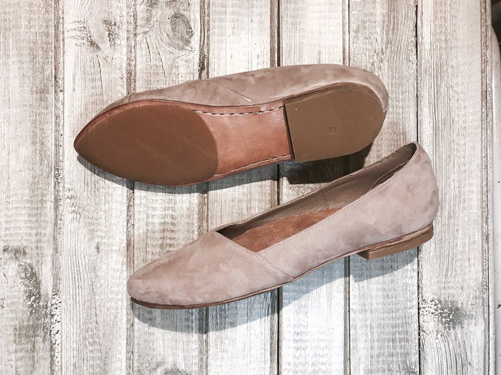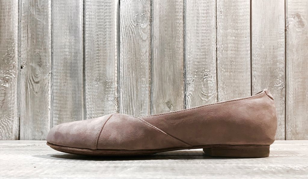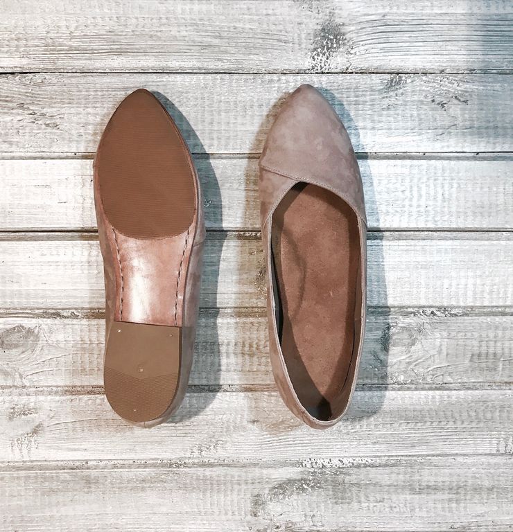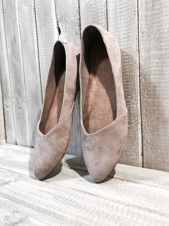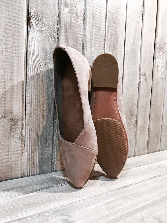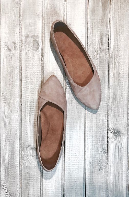 Особенности: балетки выполнены на кожаной подошве, верх обуви - из натурального кожаного велюра пудрового цвета. Заостренная форма носочной части.