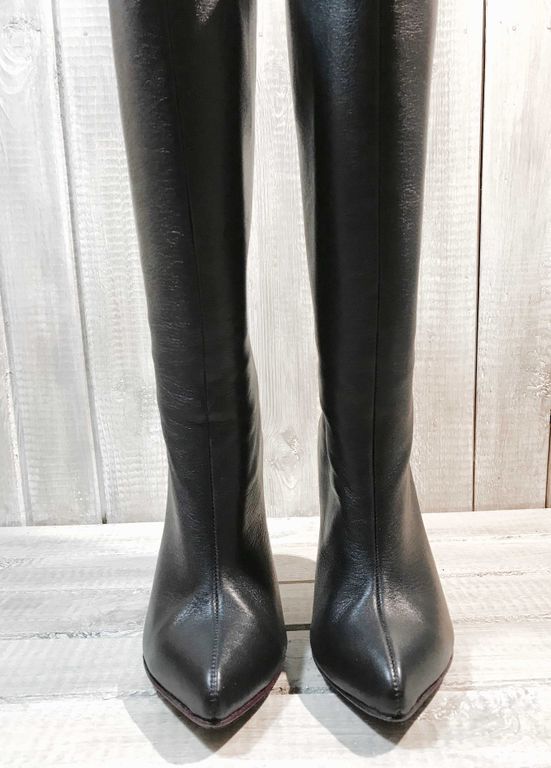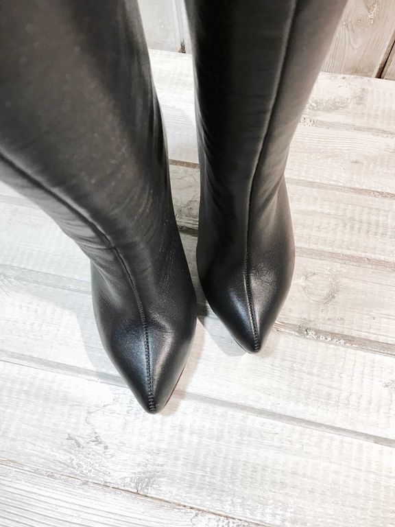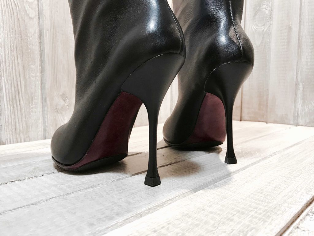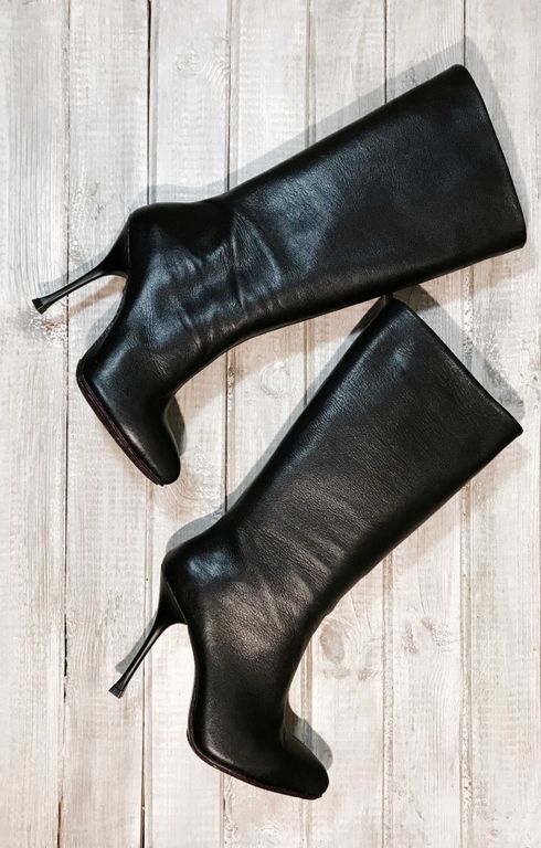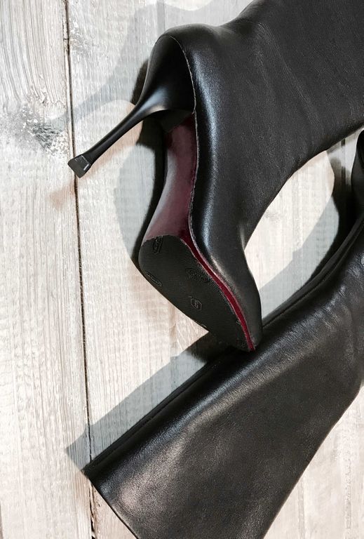Особенности: свободное голенище, красивое сочетание каблука "тонкой шпильки" и объемного верха, кожаная подошва бордового цвета