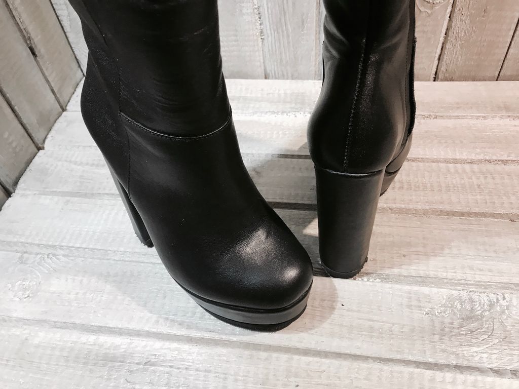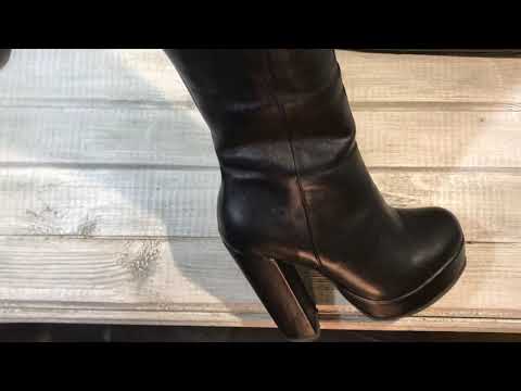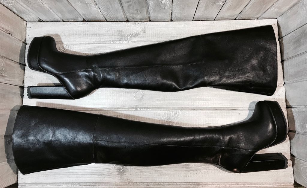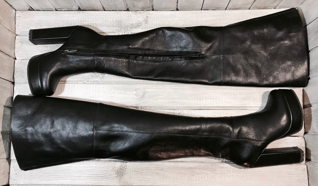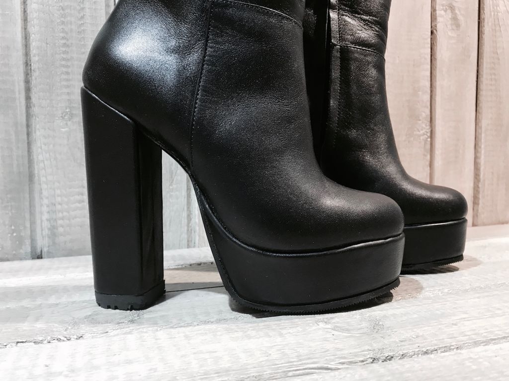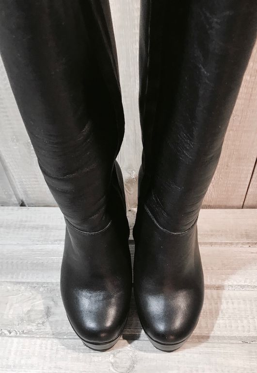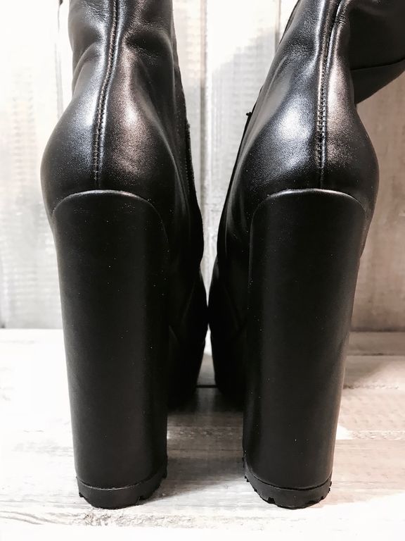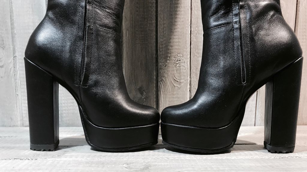 Особенности: высокие ботфорты, платформа и каблук-столбик. В области под коленом вставлена резинка клином для удобной ходьбы и приседания