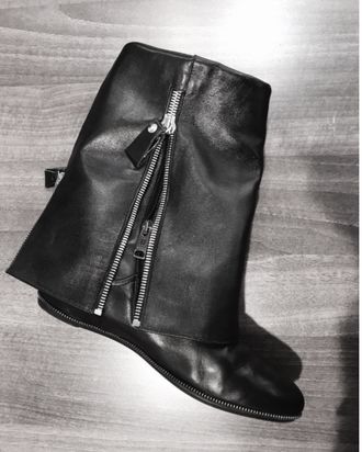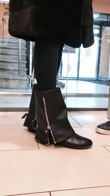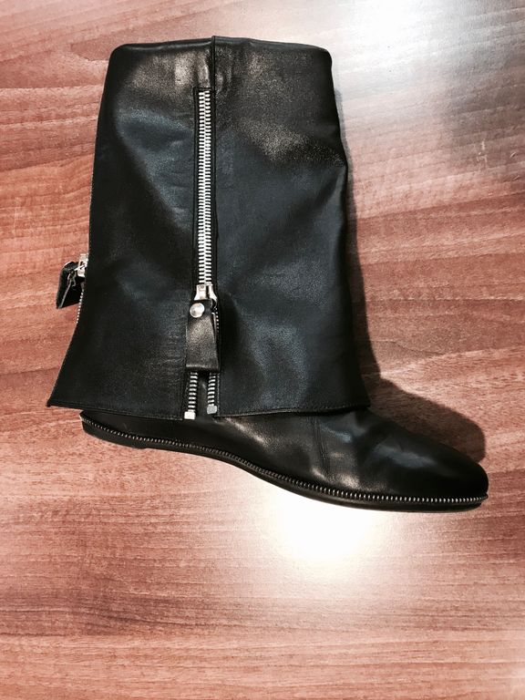 Гамаши женские. Эта модель была сделана, как съемный аксессуар на сапоги. Крепление к голенищу посредством кнопок. Каждый гамаш украшен тремя декоративными молниями с крупной змекой. Обратите внимание на кожаные шлевки на собачке молнии.