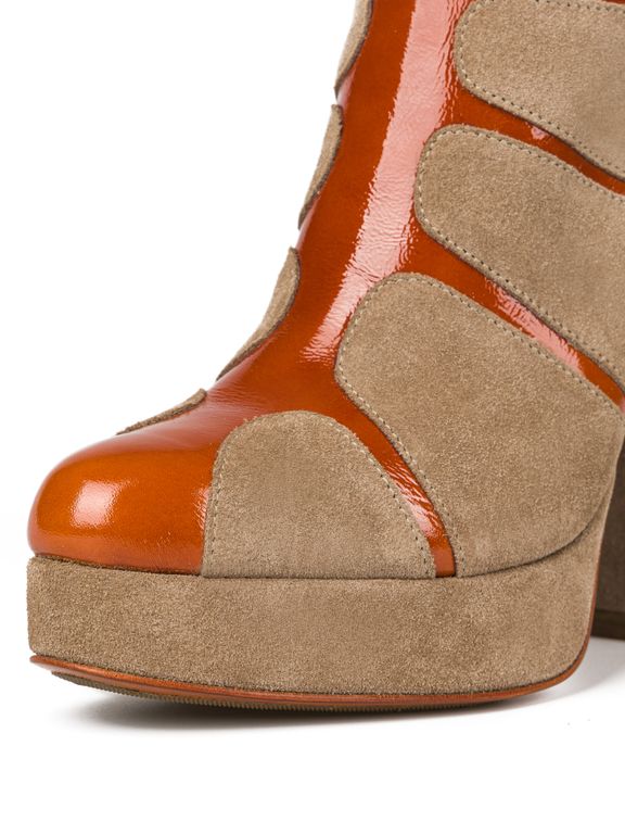 Ботильоны изготовлены с декоративной лаковой деталью на передней части верха обуви. В модели применены приемы ИЗВ (иллюзий зрительного восприятия) - дизайн верха, разность фактур и форма каблука зрительно уменьшают размер стопы. Модель выполнена на удобной высококаблучной колодке с высотой приподнятости пяточной части (над опорой) - 95мм.